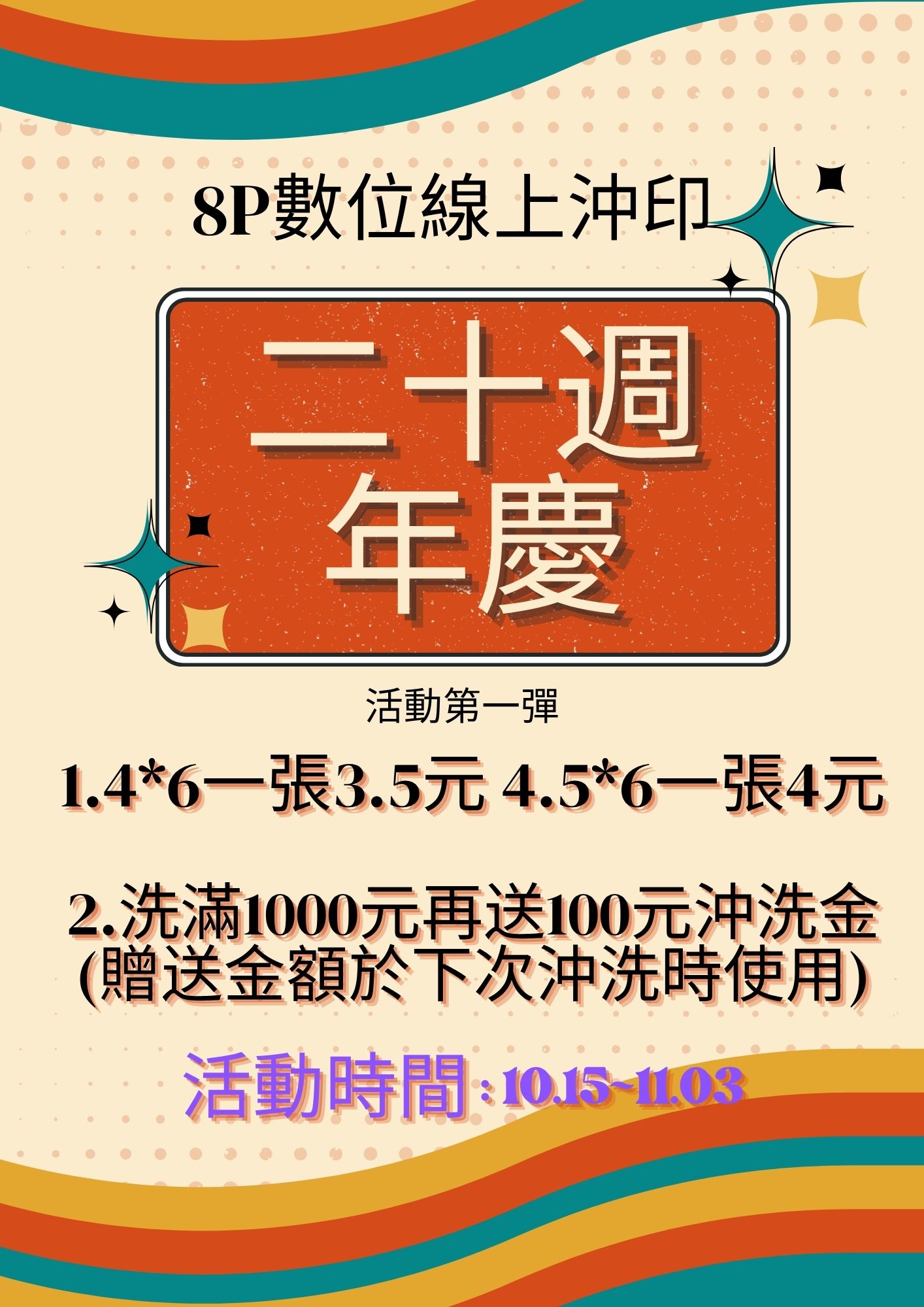 前面嘮叨太多都忘記切入正題了,20周年活動開跑啦,這次活動會有兩波,第二波預計在11月舉辦,不過以優惠來說第一波還是最划算,差不多是打79折的概念,想要洗照片出來保存的人可以把握這一次的活動喔!!!